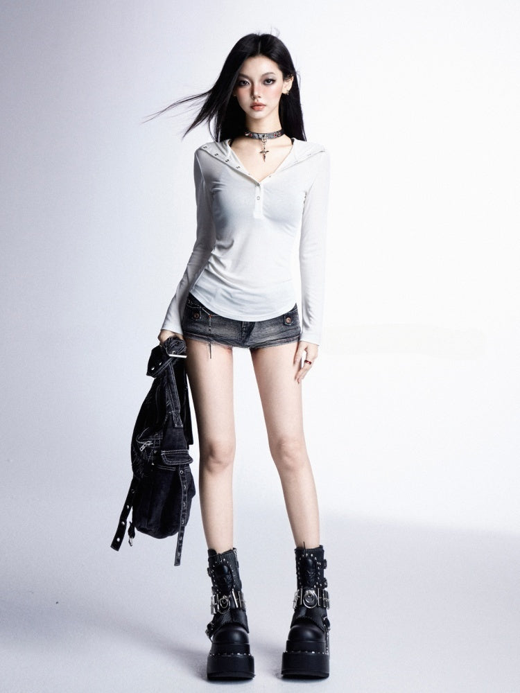 Snap Placket Neckline Sun Protection Hooded Top White Partial