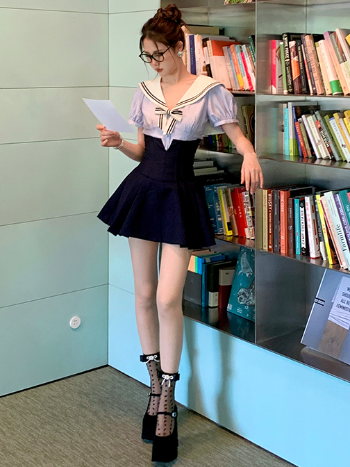 Blue and White Old School Lolita Fashion Dress Bowknot Detais JSK Set
