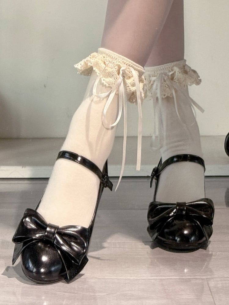 Decorated Lolita Multi-Layer Calf White/Black Bow Trim Lace Socks