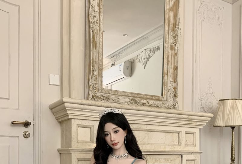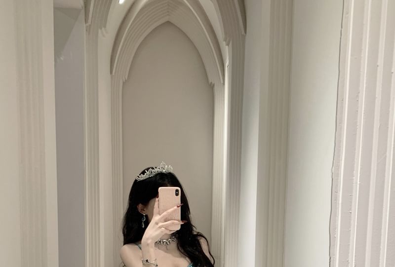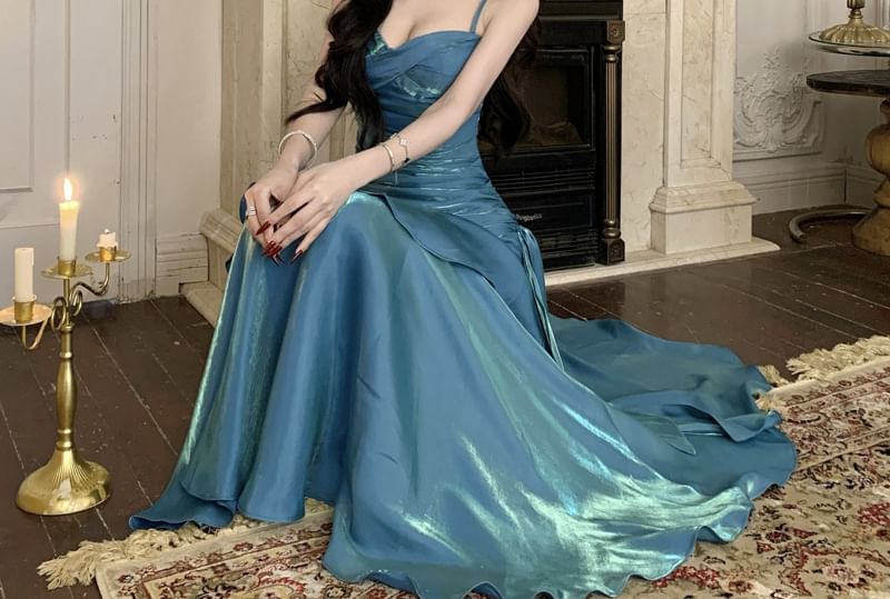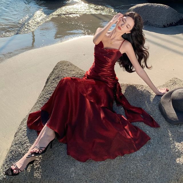 Spaghetti Strap Plain Asymmetrical Ruched Tiered Maxi A-Line Dress