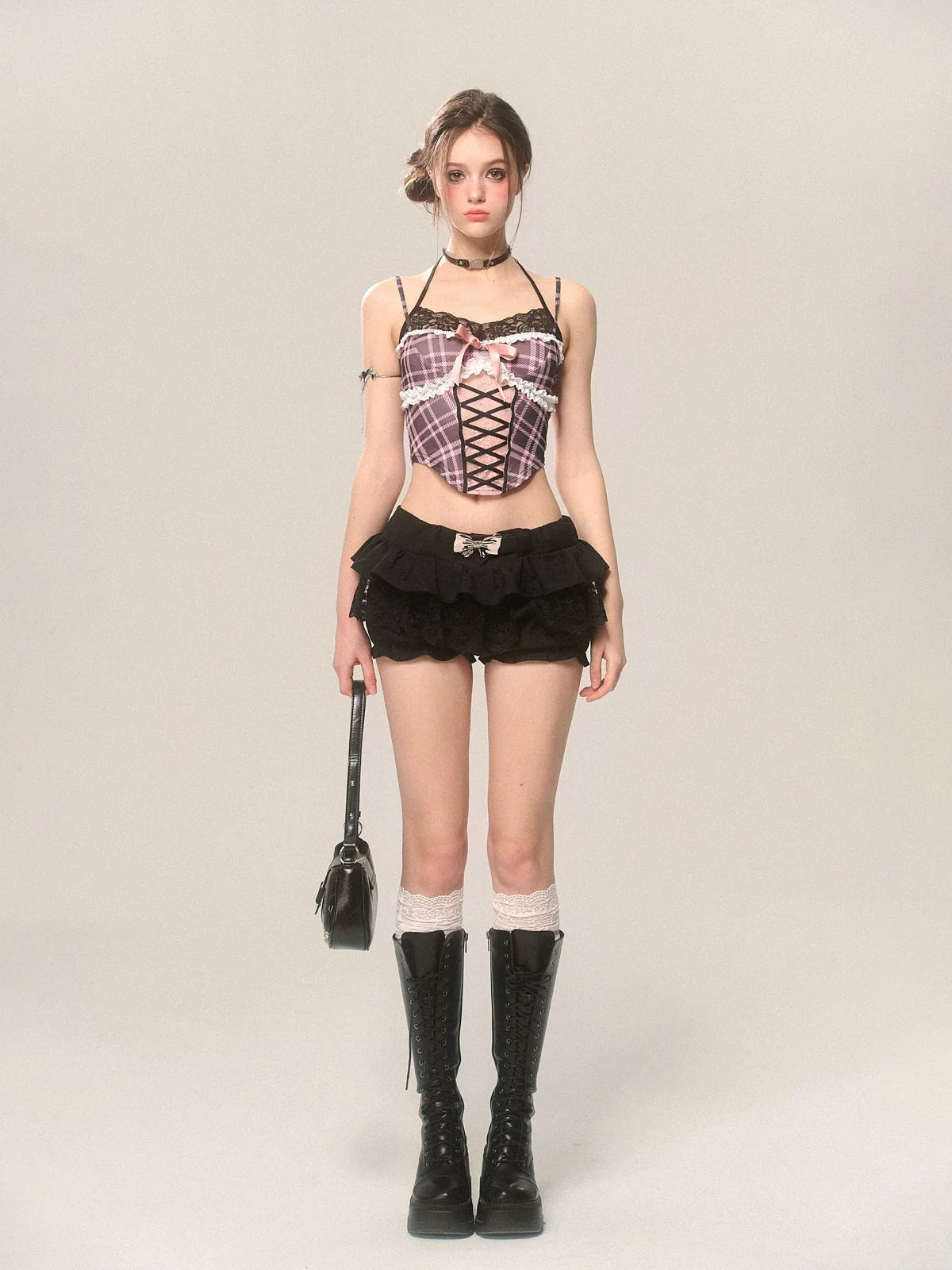 Spicy French Halter Strap Top Lace Cami Check Sweet