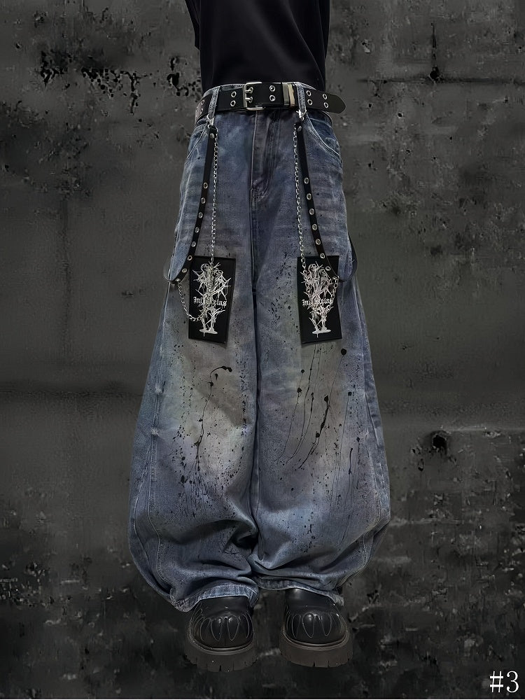 Splatter with Punk and Faded Appliques Blue Random Wide-Leg Jeans Wash Embroidered