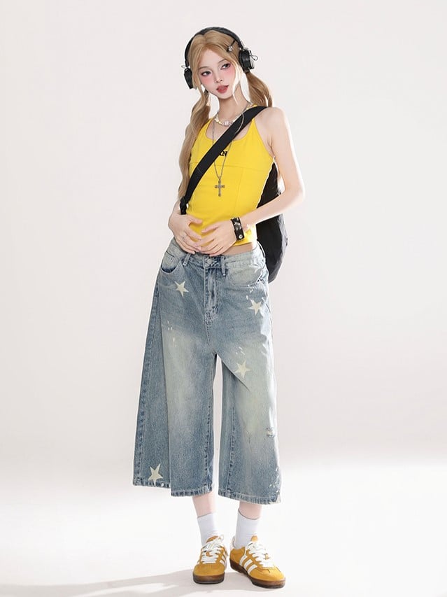Starry Blue Faded Wash Denim Capris Pants with Distressed Holes