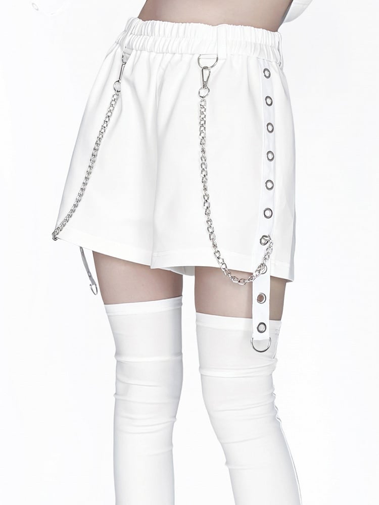 White/Black Jirai Kei Shorts with Chain & Strap Decorations