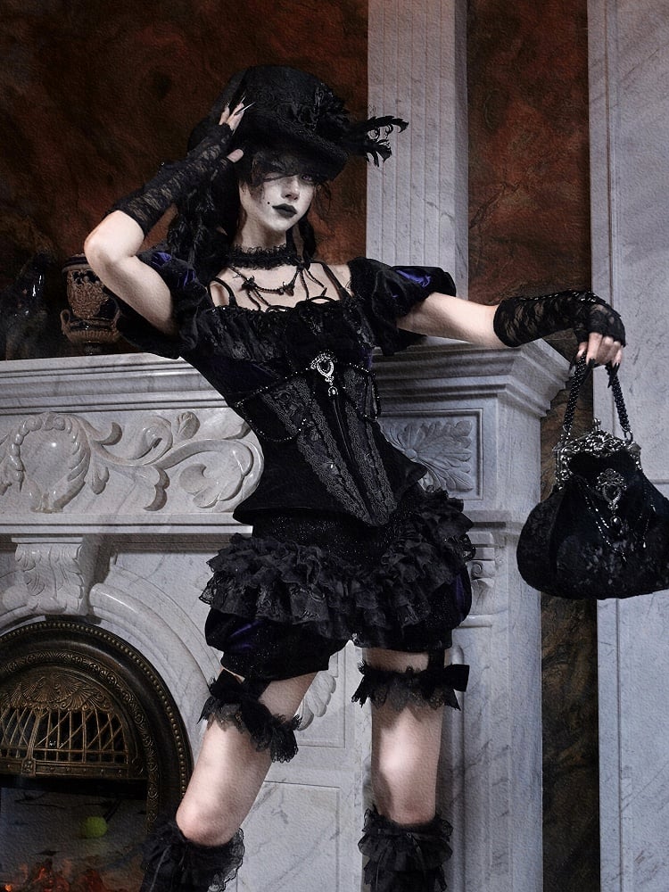 Goth-Style Slim Cut Glittery Puff Sleeves Top with Open Back and Adjustable Cross Shoulder Straps