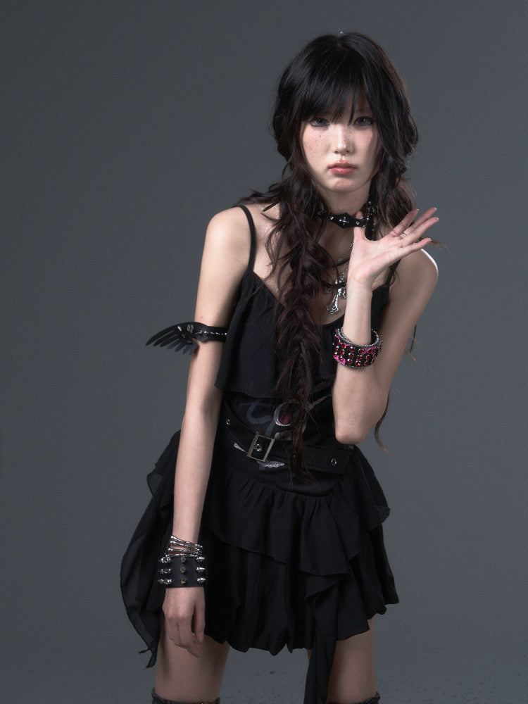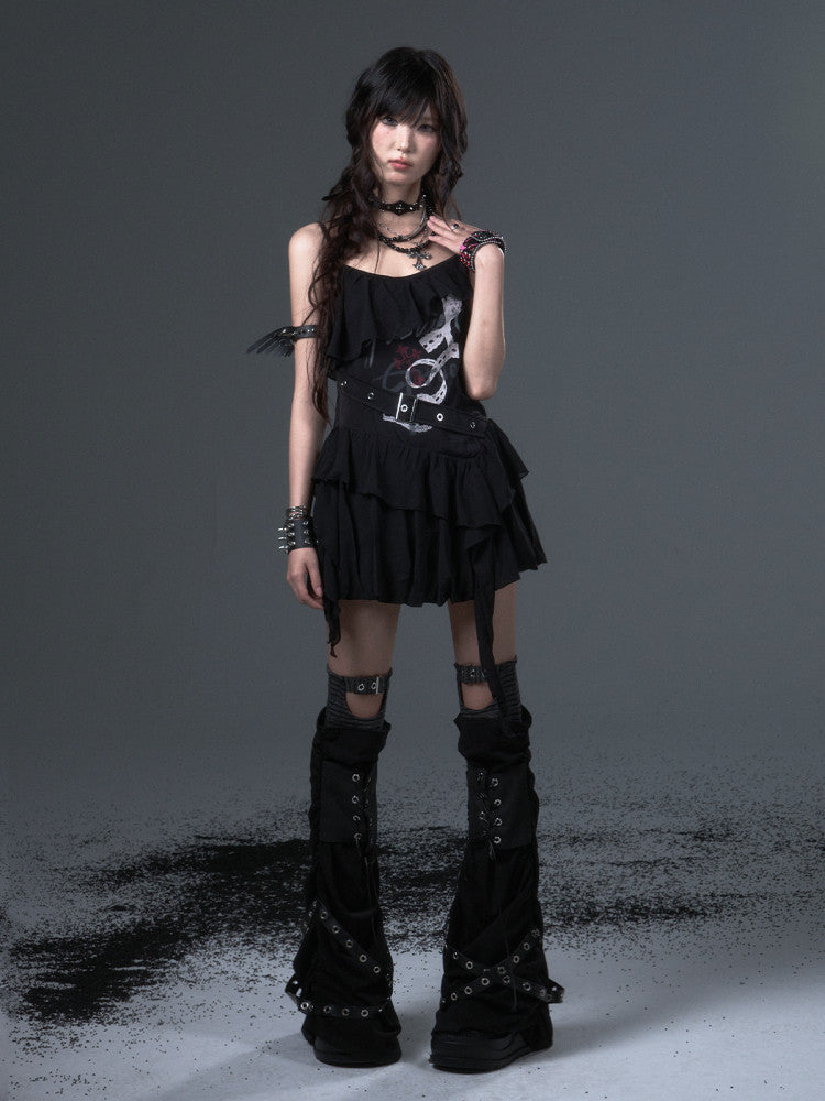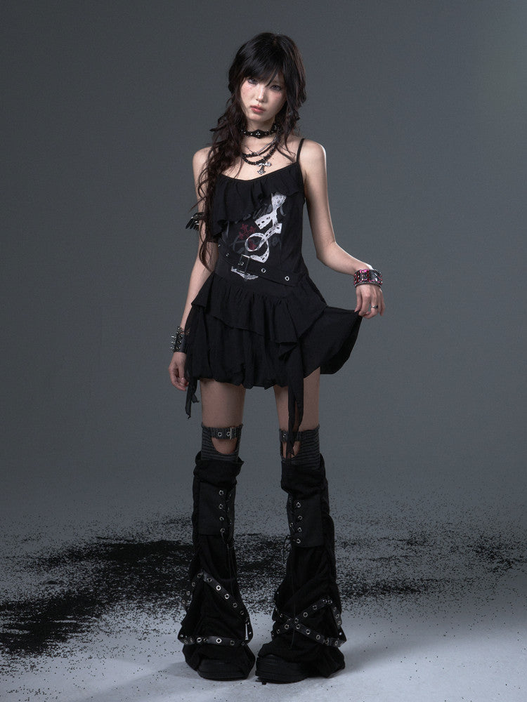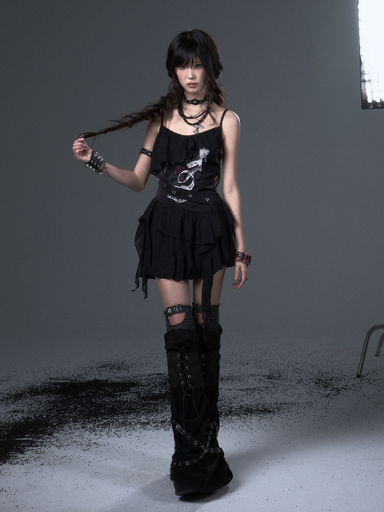 Straps Thin Black Print Slim-fitting Shoulder Top Cami - Floral Ruffled Trim