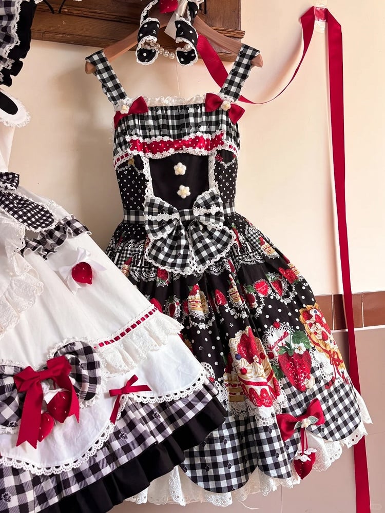 Black & White Strawberry Cake Print Lolita JSK Dress with Scalloped Eyelet Trim