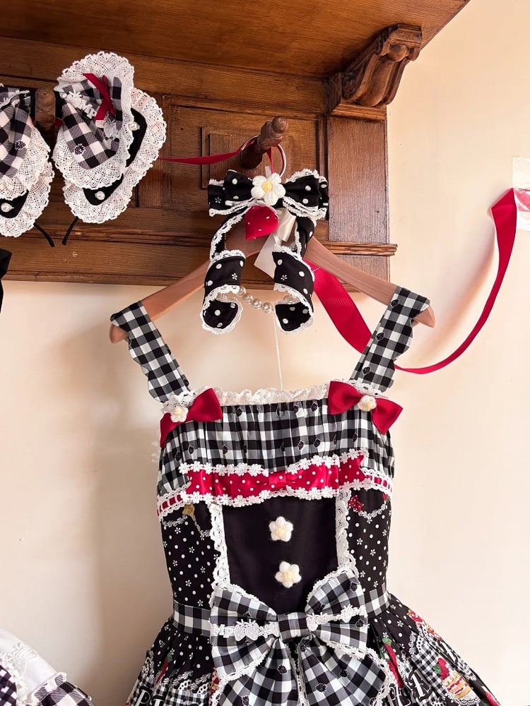Strawberry Lolita Trim JSK Black Dress White Eyelet Print Cake with Scalloped