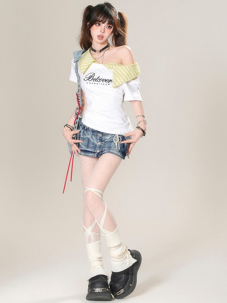 White Glamorous Striped Pattern Asymmetrical Neckline Letter Print T-shirt