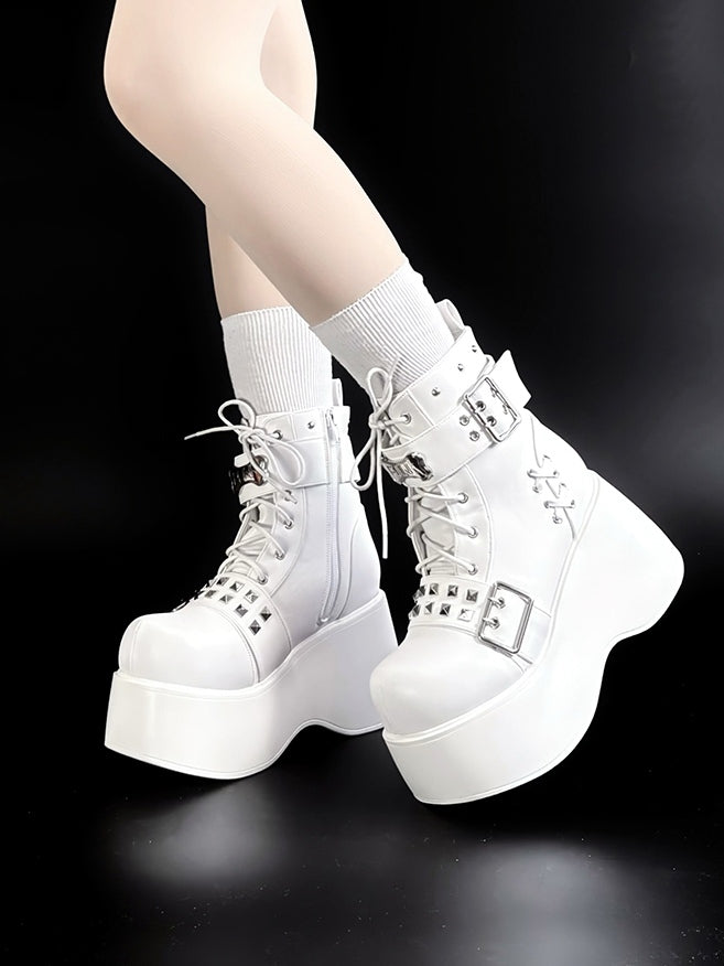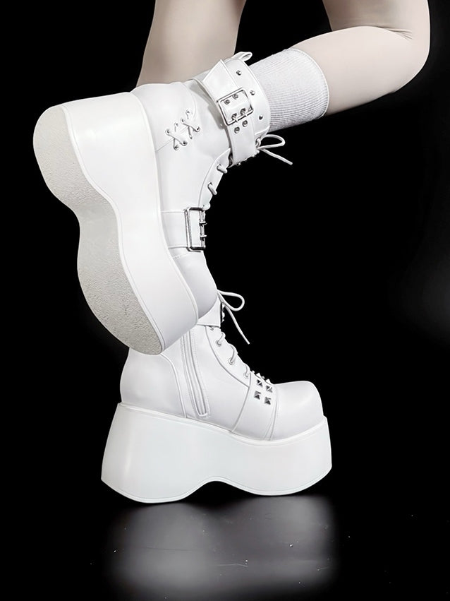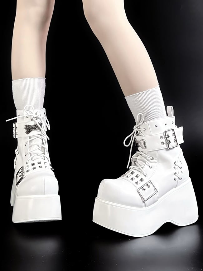 Stud Work, Bone Elements & Functional Lace-Up+Strap Design PU Matte White Platform Boots in Punk Style