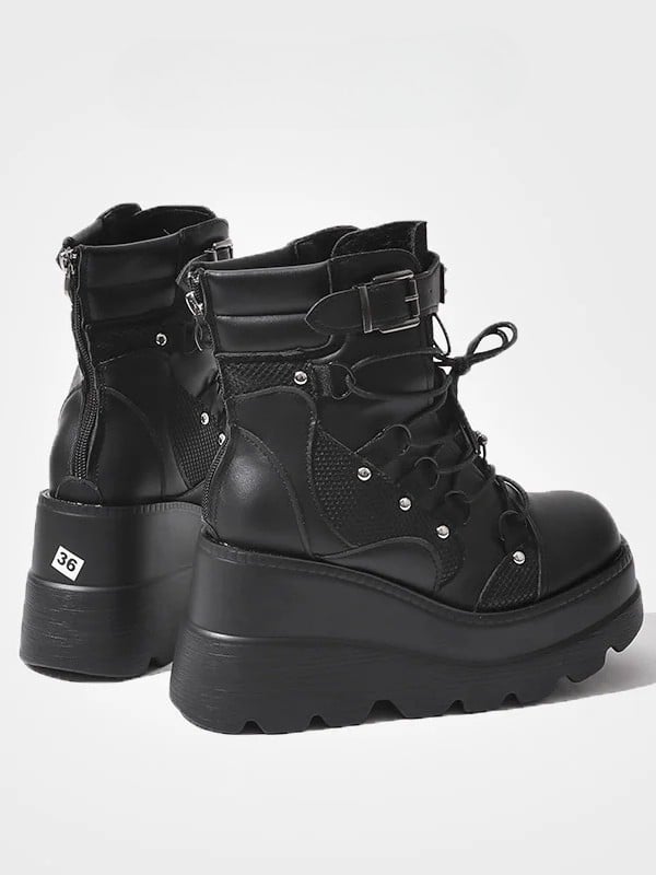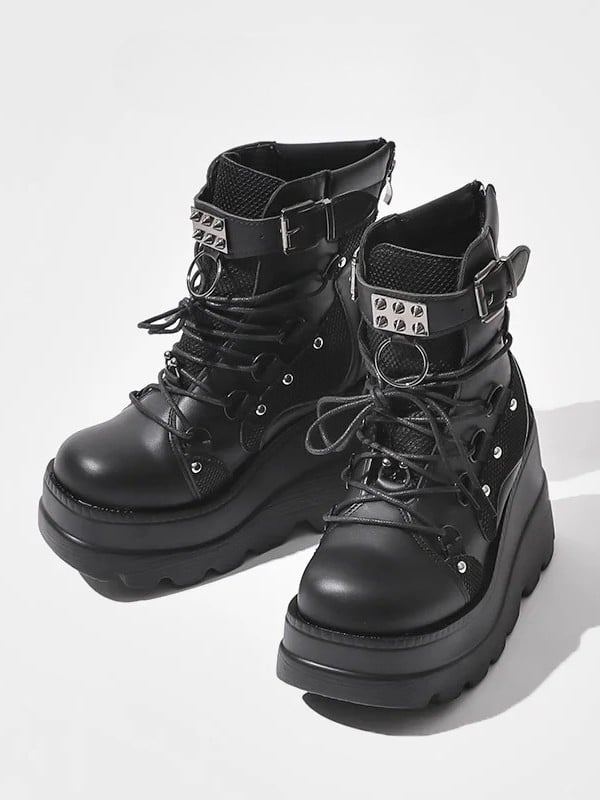Platform Black Ankle Boots in Gothic Style - Lace-up Closure, Studded Buckle Strap & Back Zip Closure