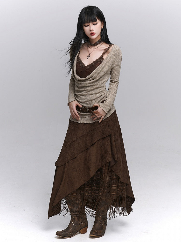 Suede Skirt Handkerchief Coffee Fringe Wasteland Punk A-Line Millard Hem with