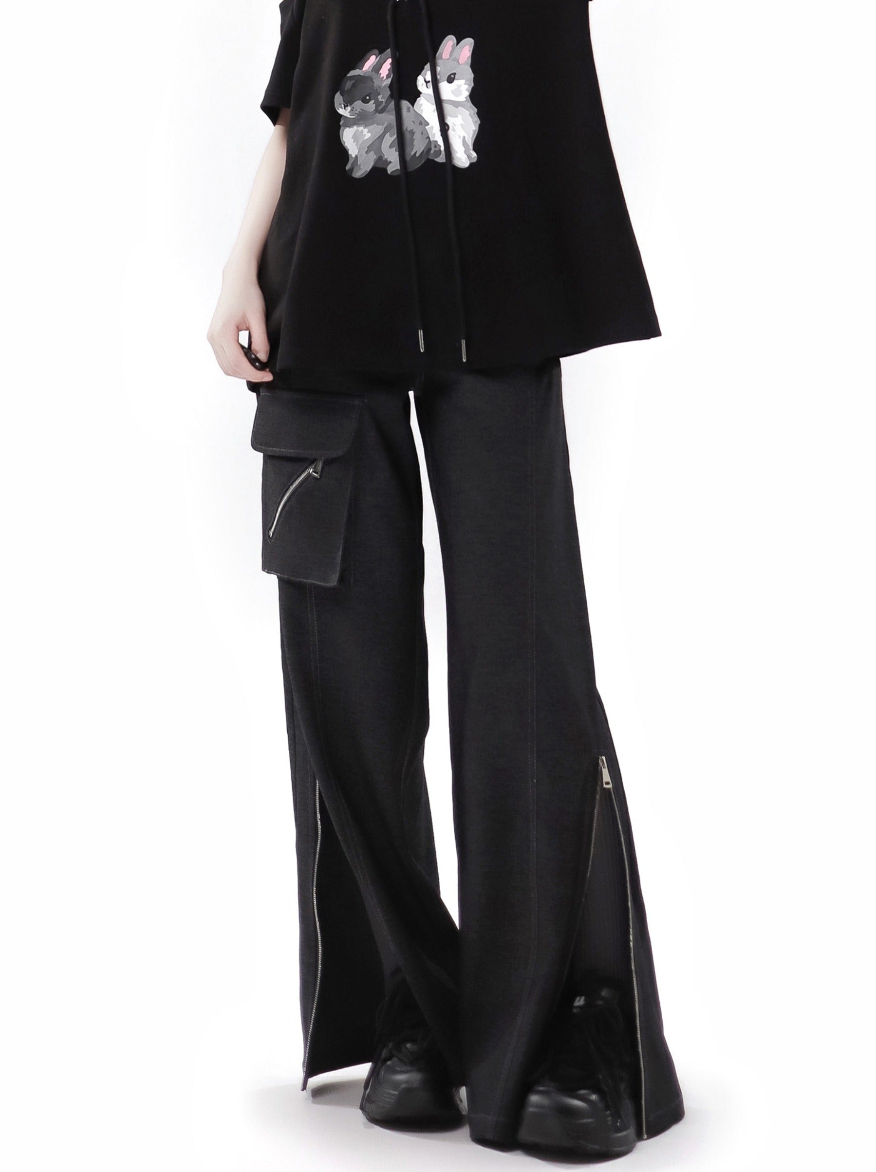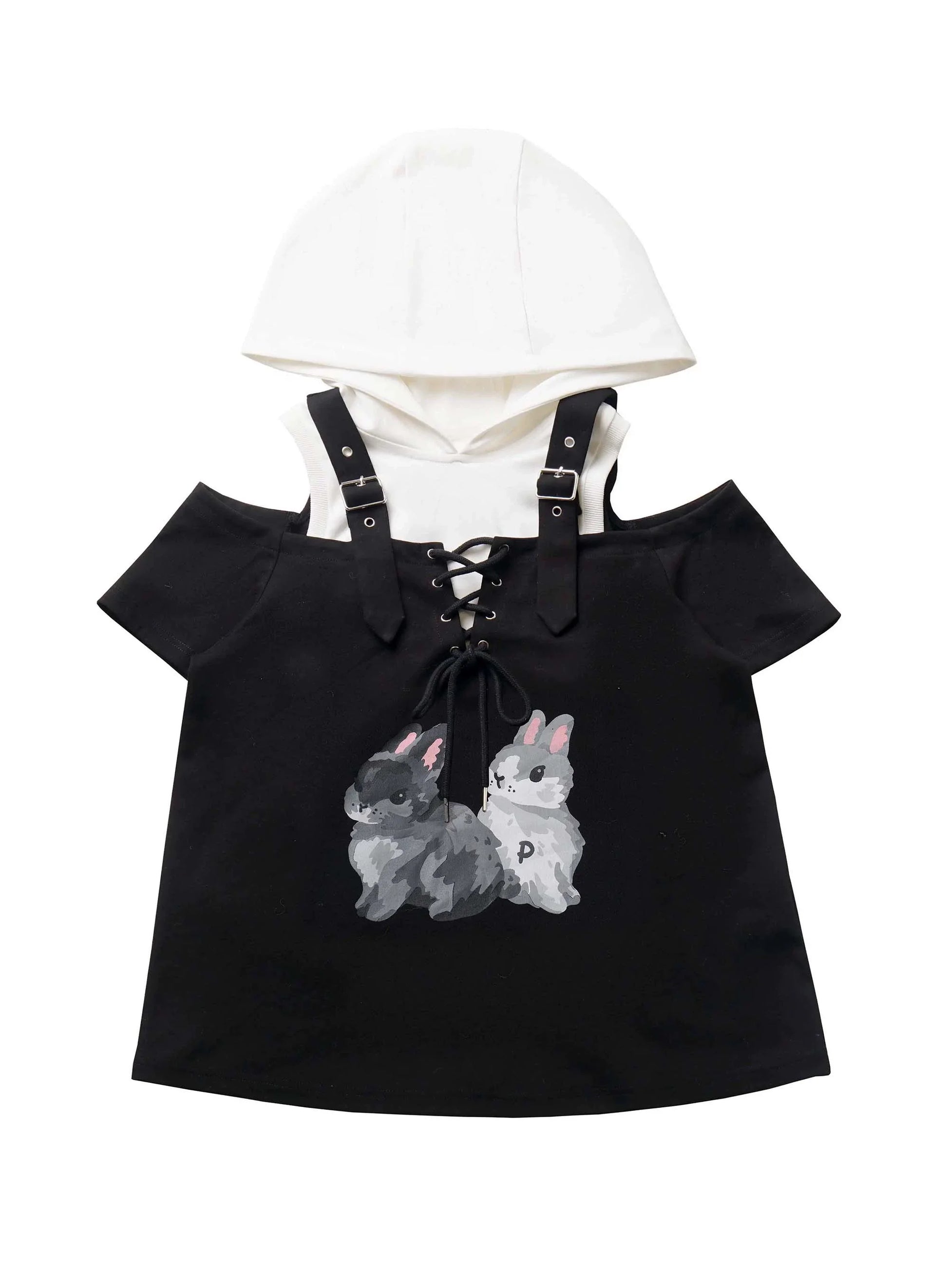 This cute outfit features a summer design, a rabbit print, and off-shoulder black and white hoodie tops. The straps pants add a stylish touch for a lovely and playful look. Perfect for warmer months and casual occasions.