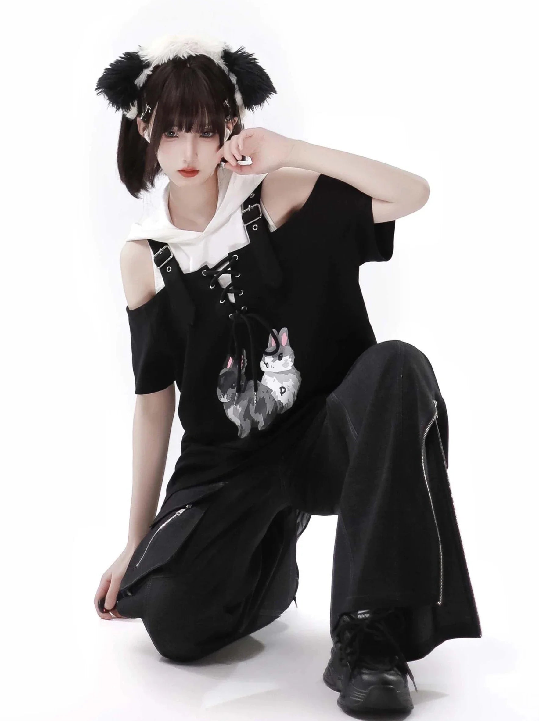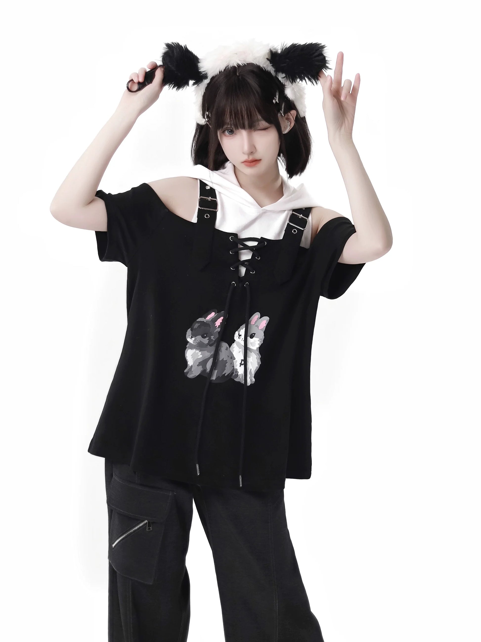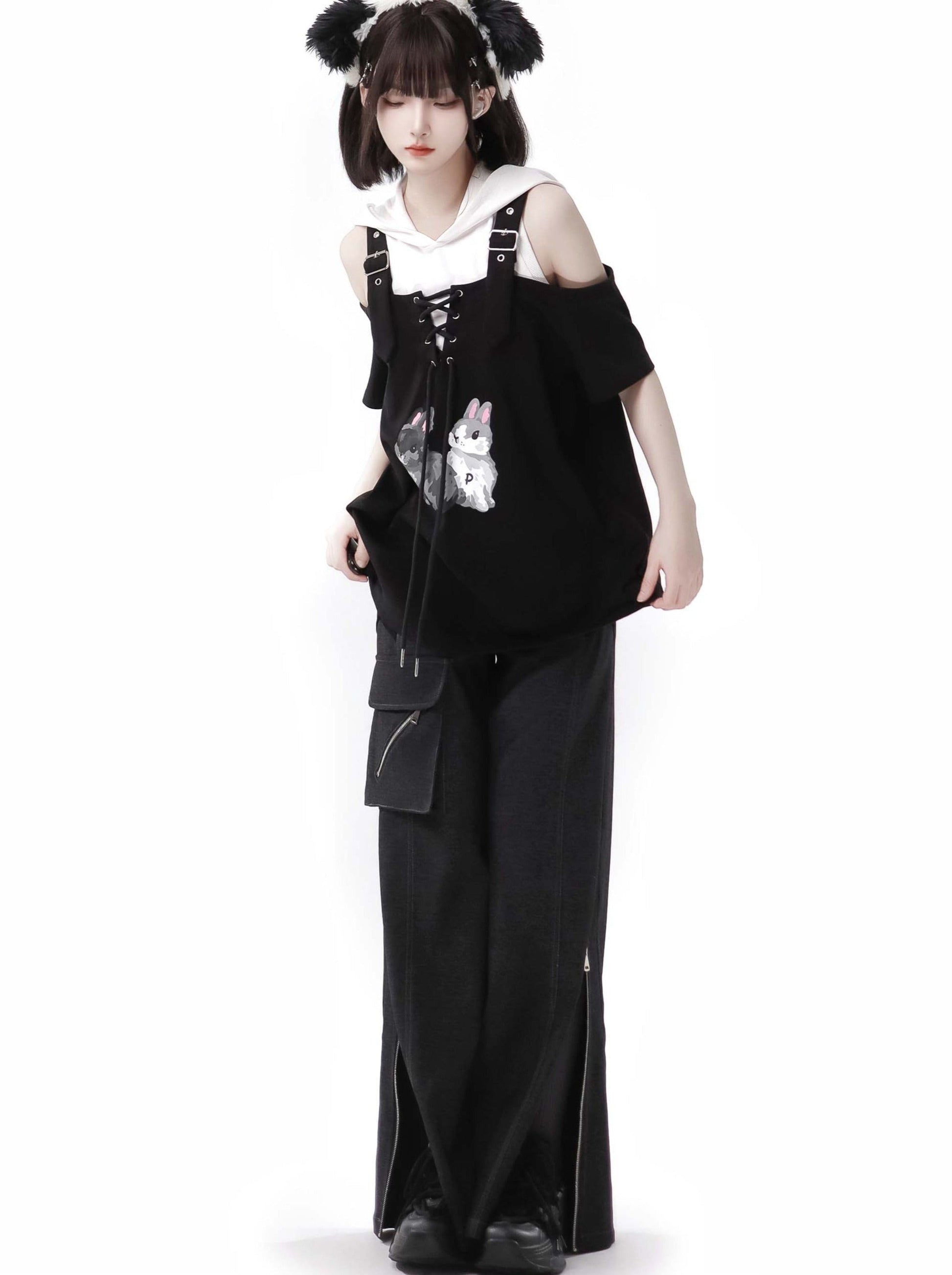Summer Design Straps Pants Rabbit Off-Shoulder Black White Hoodie Tops Suit