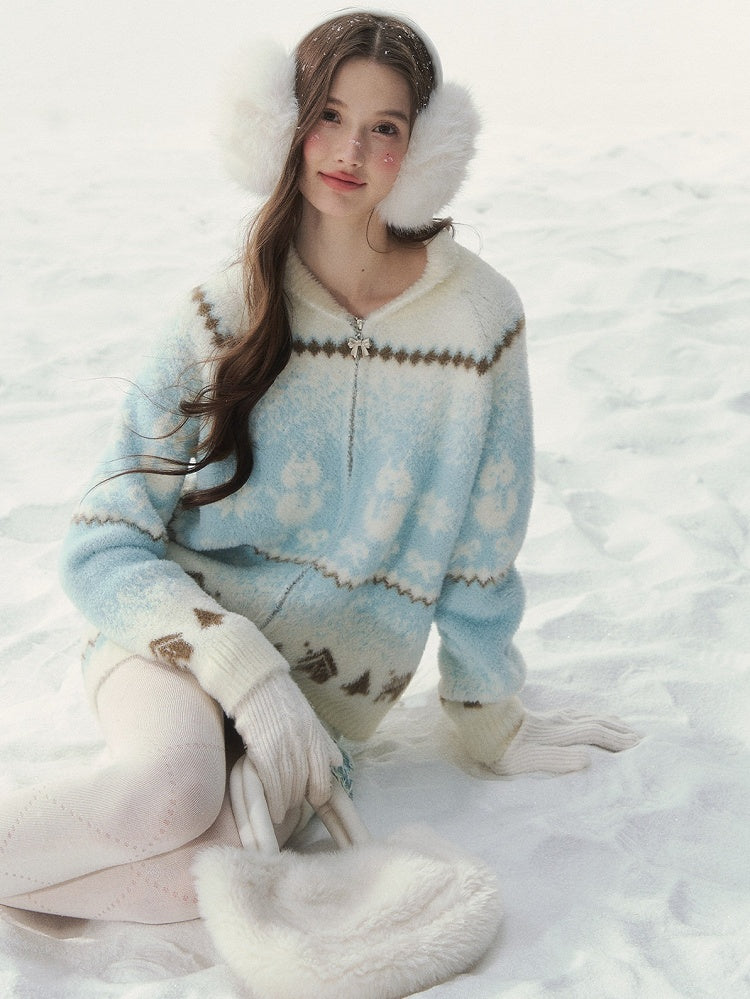 Blue&White Snowman Sweater with Kawaii Pattern Details