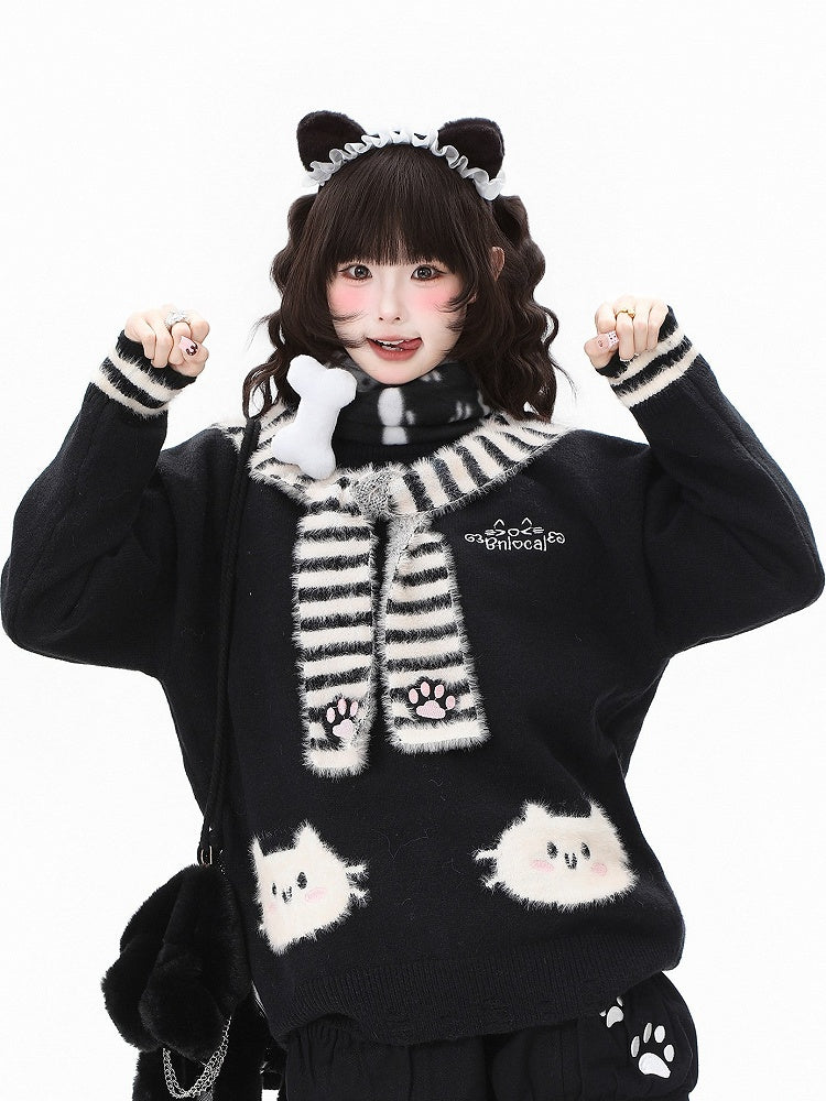 Apricot/Black/Blue Daily Kawaii Sweater with Cat Pattern & Striped Scarf with Cat Paw Embroidery