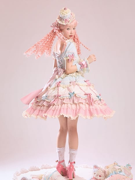 Blue and Pink Square Neckline and Puff Sleeves Sweet Bowknot Details Lolita Dress