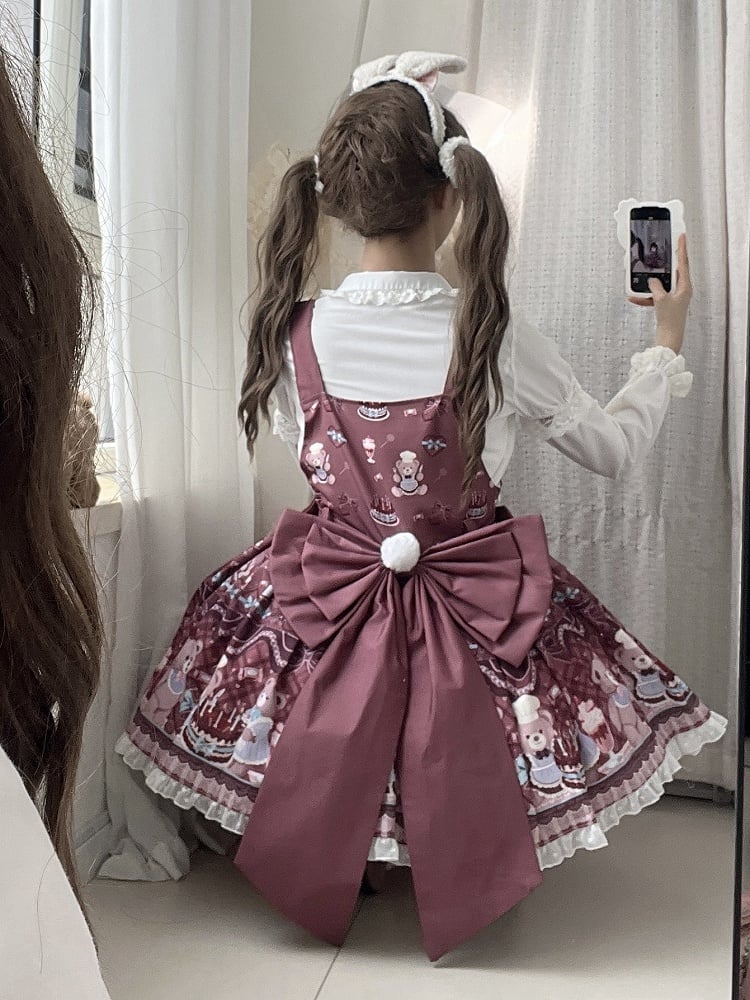 Reddish Brown Sweet Lolita Bear and Cake Print Overall Dress + Big Bow Train
