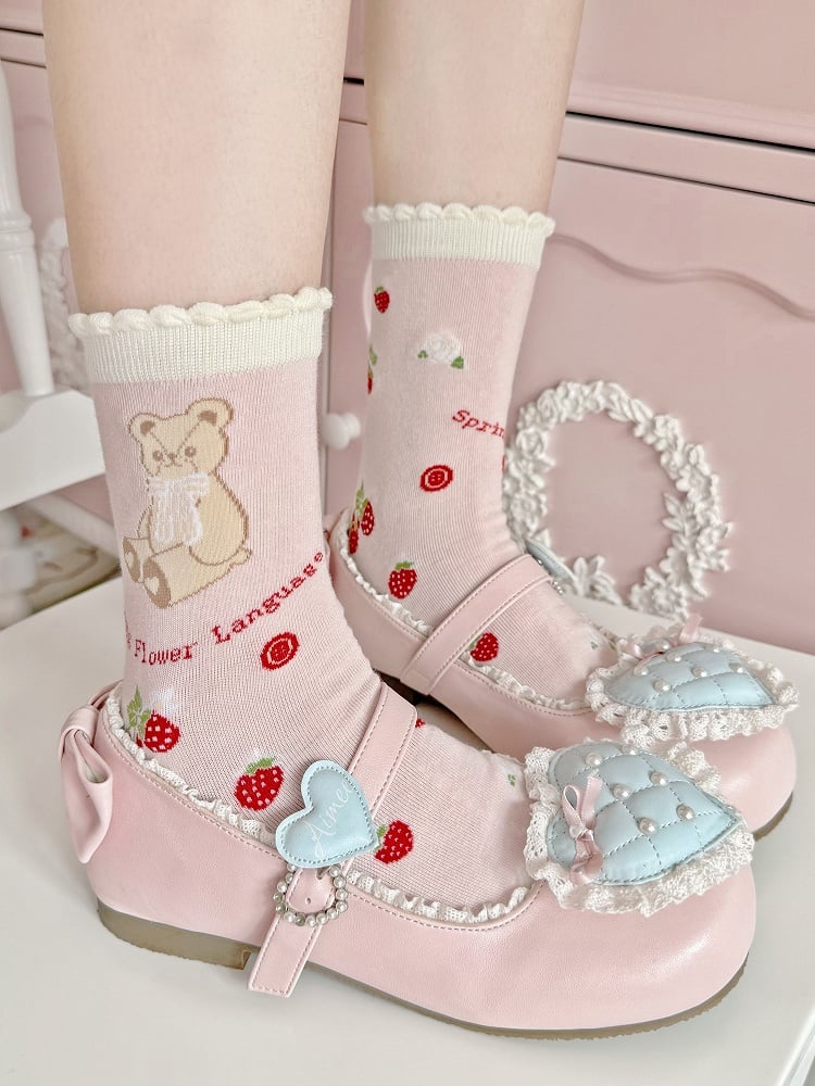 Sweet Pattern Lolita Bear Strawberry Ruffled Bunny Socks Cotton Theme and 4 Colors