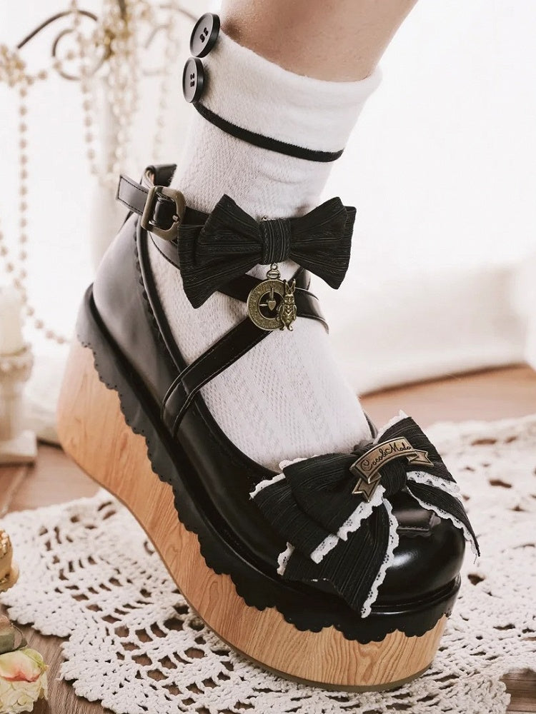 Black Sweet Lolita Round Toe Platforms - Clock Charm & Bow Accents