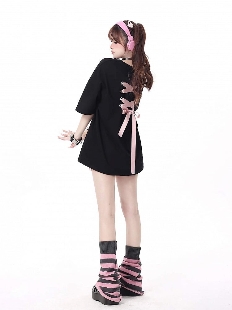 Black Bow Print T-shirt with Back Lacing Details & Multi-Color Ribbons