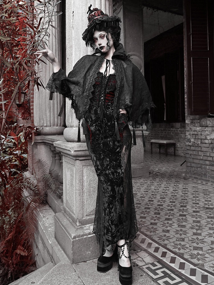 Black Goth Vampire Stand Collar Lace Shawl Cape Tassels Hem