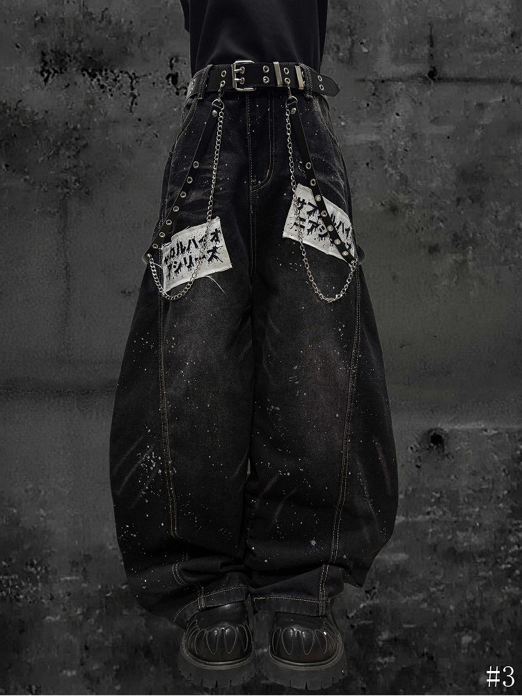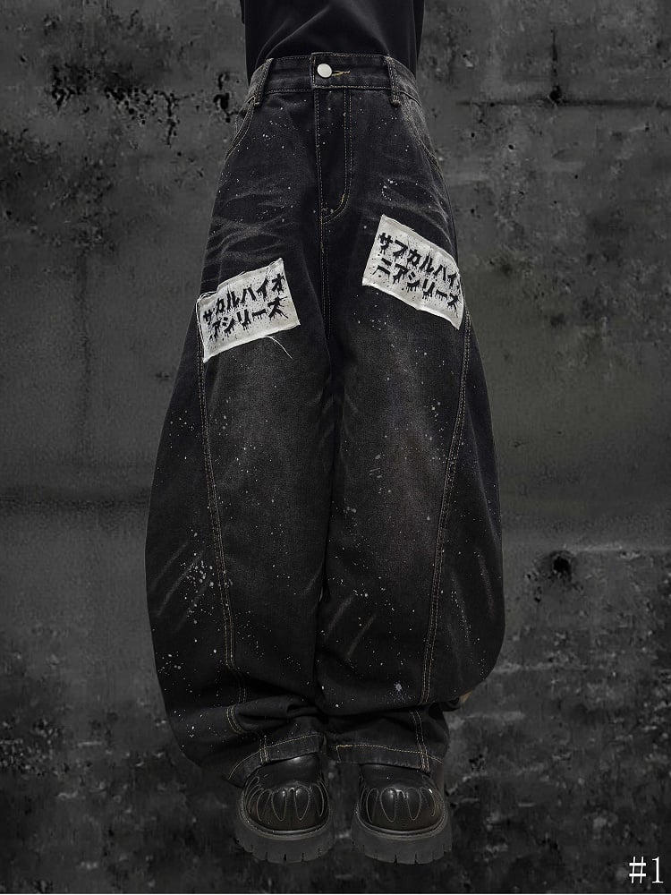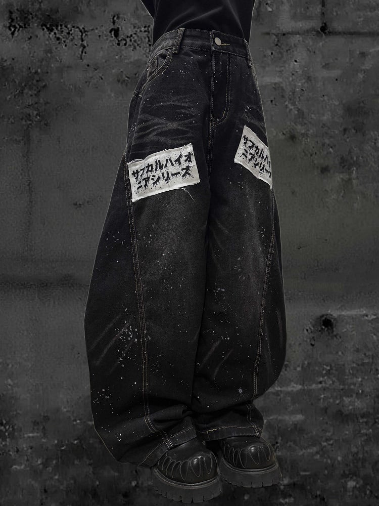 Vintage Black Splatter Wide-Leg Jeans with Text Applique Accents