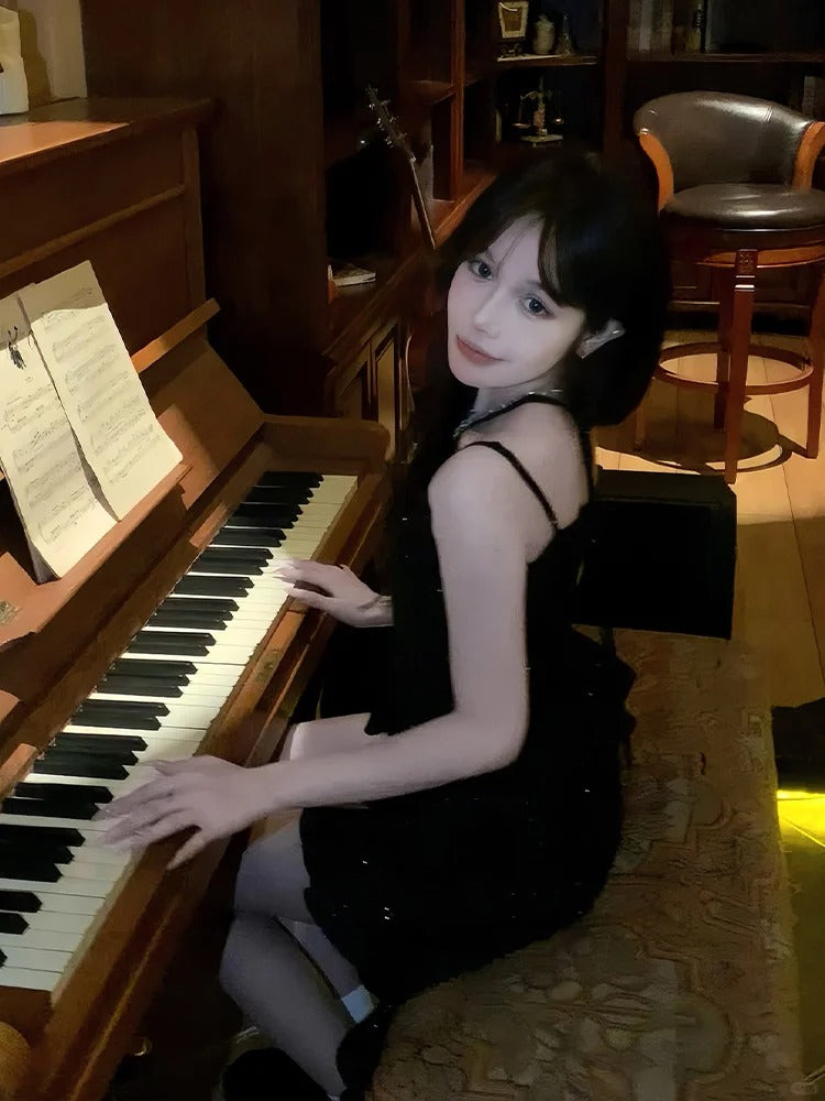 Black Sweetheart Neckline Tiered Ruffles High-Low Skirt Sequins Slip Dress