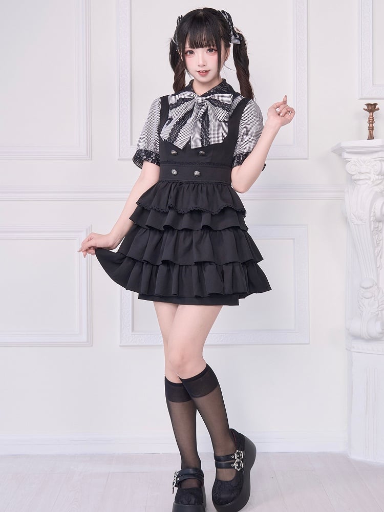 Jirai Kei Black Tiered Overall Dress 2-Way Wear with Adjustable Back Ties