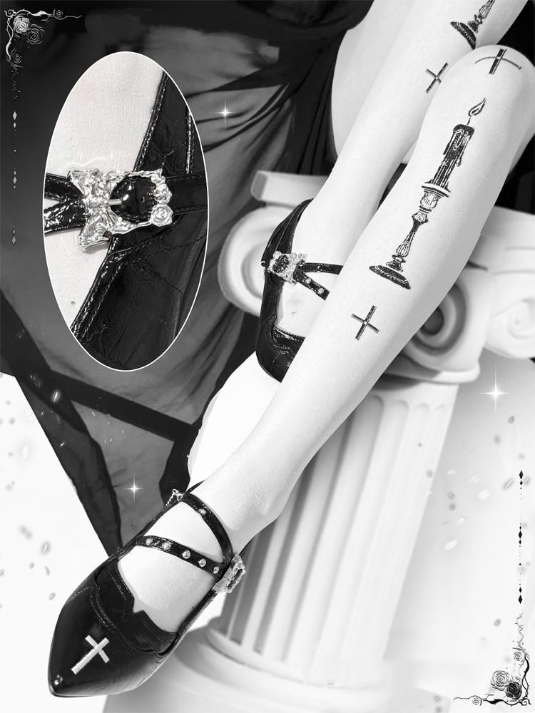 Dark Gothic Pointed Toe Black Mary Jane Shoes 7cm Chunky Heel & Cross Embroidery