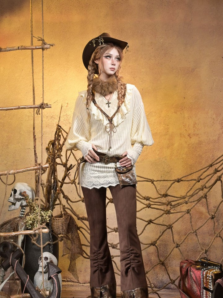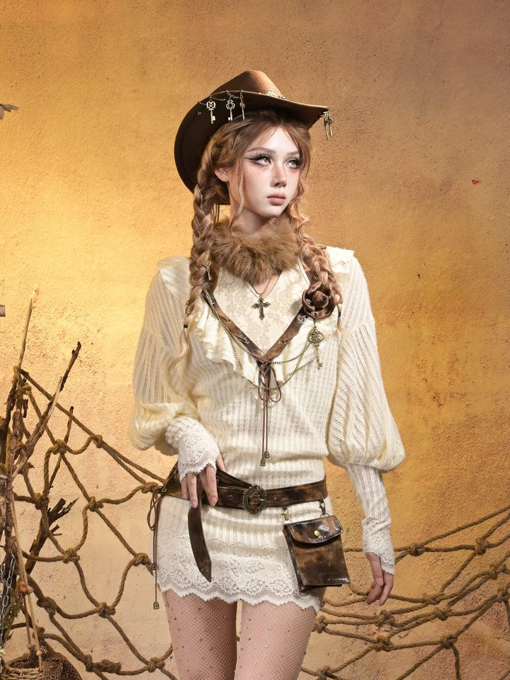 Beige Halter Tie Punk Top with Floral Shimmer & Brown Faux Fur Collar
