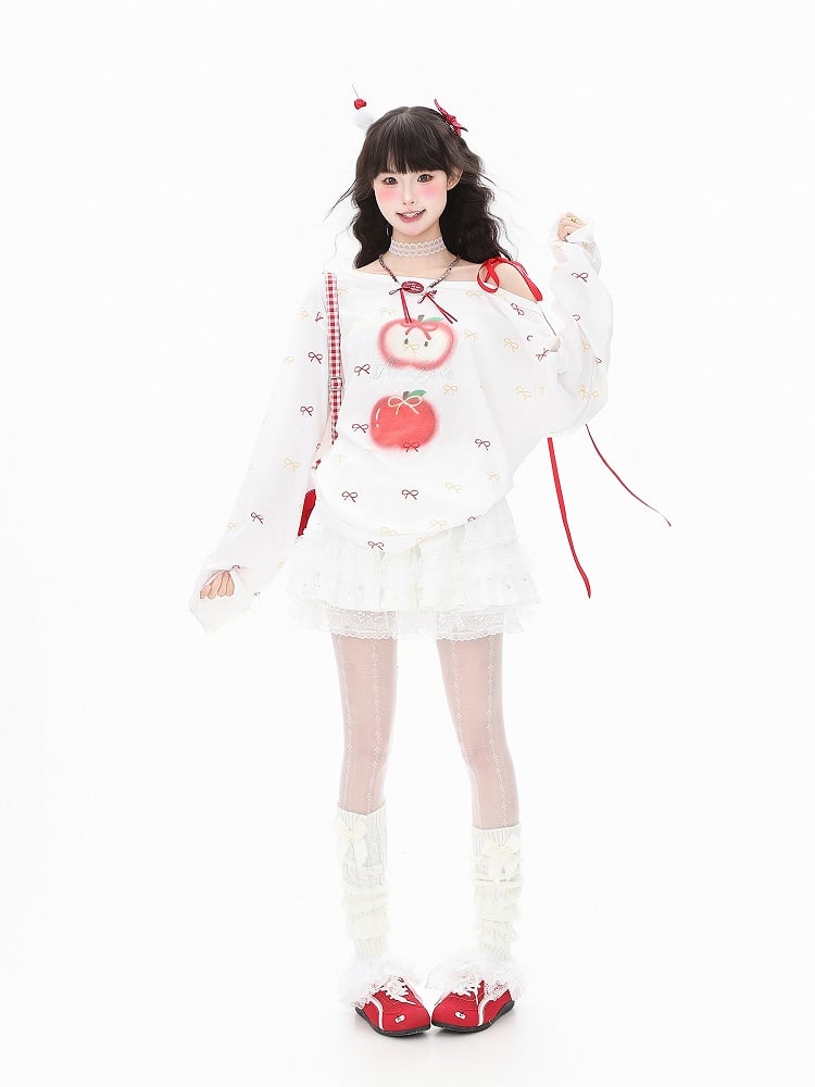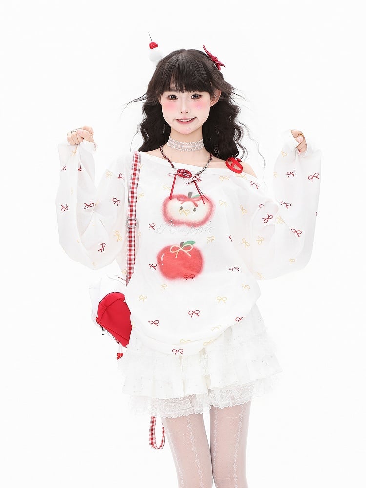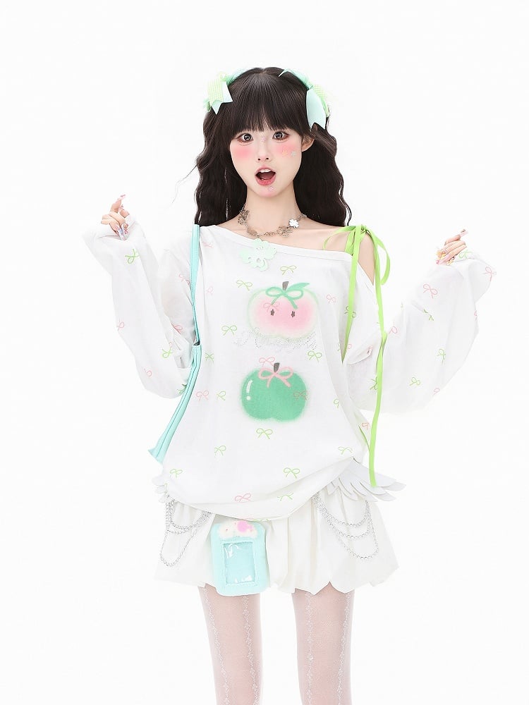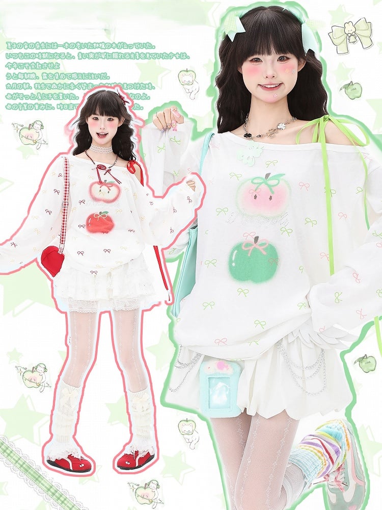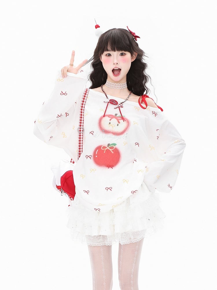 Red/Green Asymmetrical One-Shoulder Long Sleeve Top with Bow and Apple Print