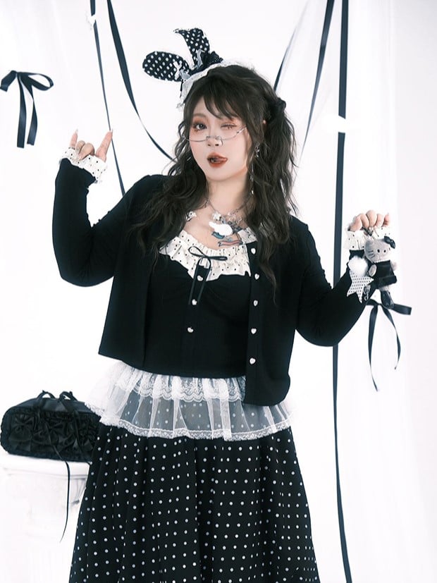 Top Size Hem Knit Polka Ruffle Neckline Black Plus Cami Dot White with Lace