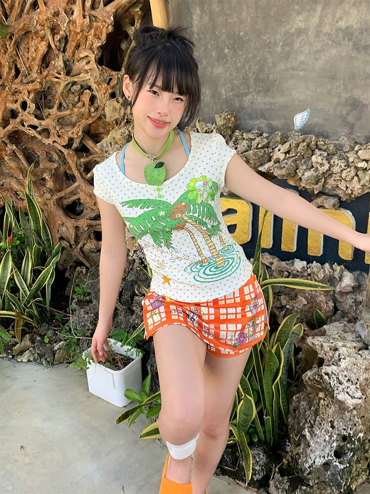 White Palm Tree Print T-shirt with Green Polka Dots and Rhinestone Details