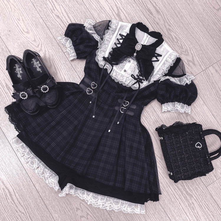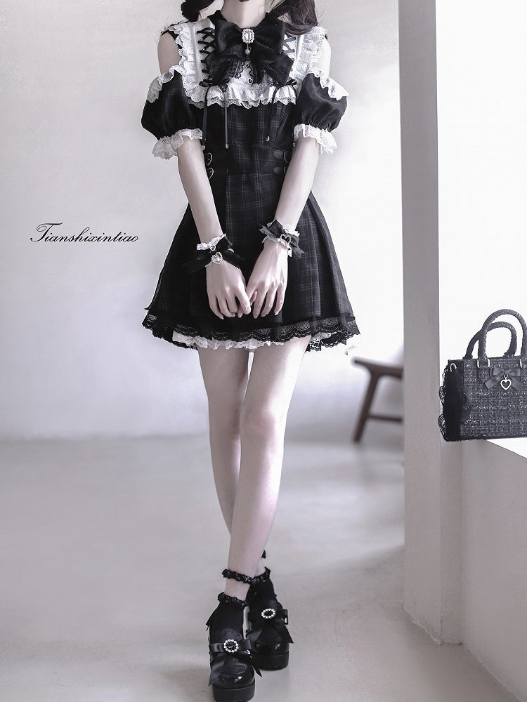 Jirai Kei Open Shoulder Dress in Black Plaid Pattern with Lace-up Neckline & White Lace Trim