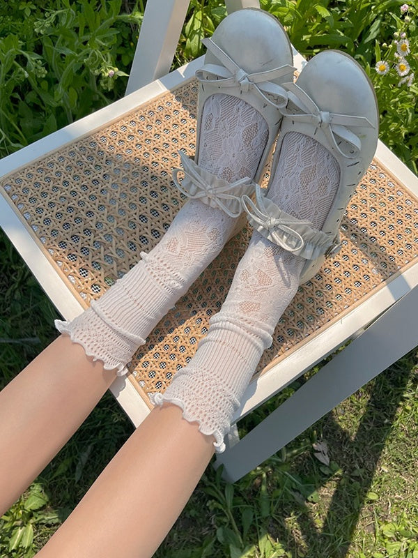 White/Black Camellia Pattern Ruffled Trim Lace Socks