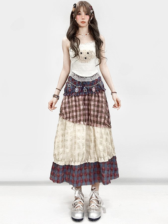 Pink Bittersweet Plaid Pattern Ruffles Trim Tiered Skirt