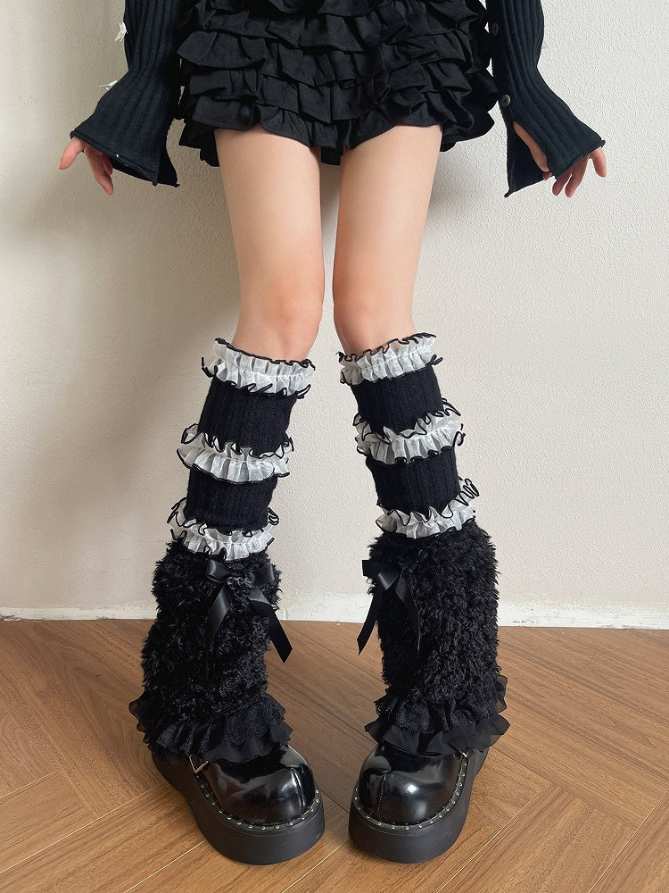 White/Black Curly Plush Lace Trim Leg Warmers with Bow Decoration