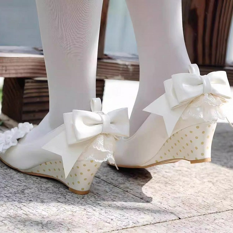 Interchangeable Lace Trimmed Heart, Bow Details & Dot Pattern Heel PU White Wedge Mary Janes in Sweet Lolita