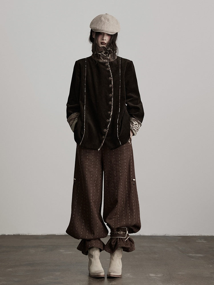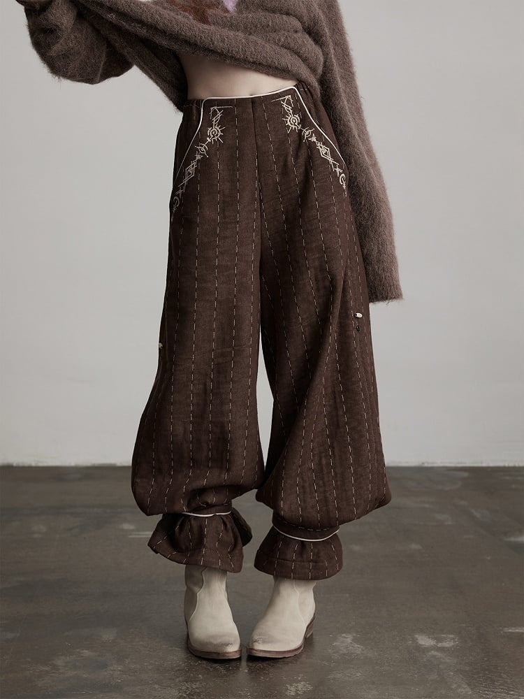 Urban Goth Dark Coffee Thick Embroidered Striped Wide-Leg Pants with Leg-Cuff Design