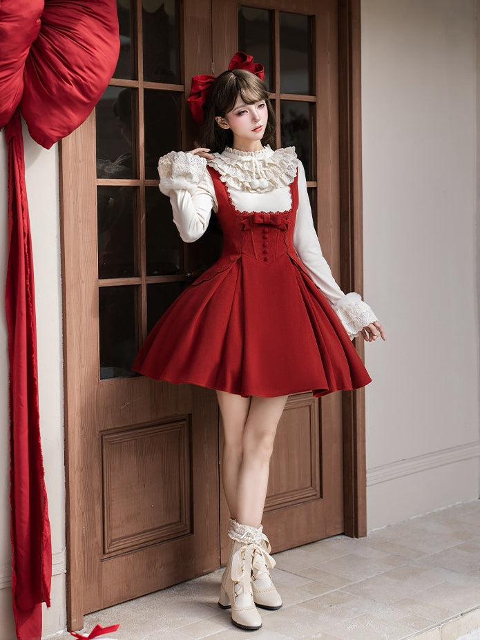 New Year Red Under Bust Lolita Short Version JSK + Beige Knit Top + Bow Hairclip