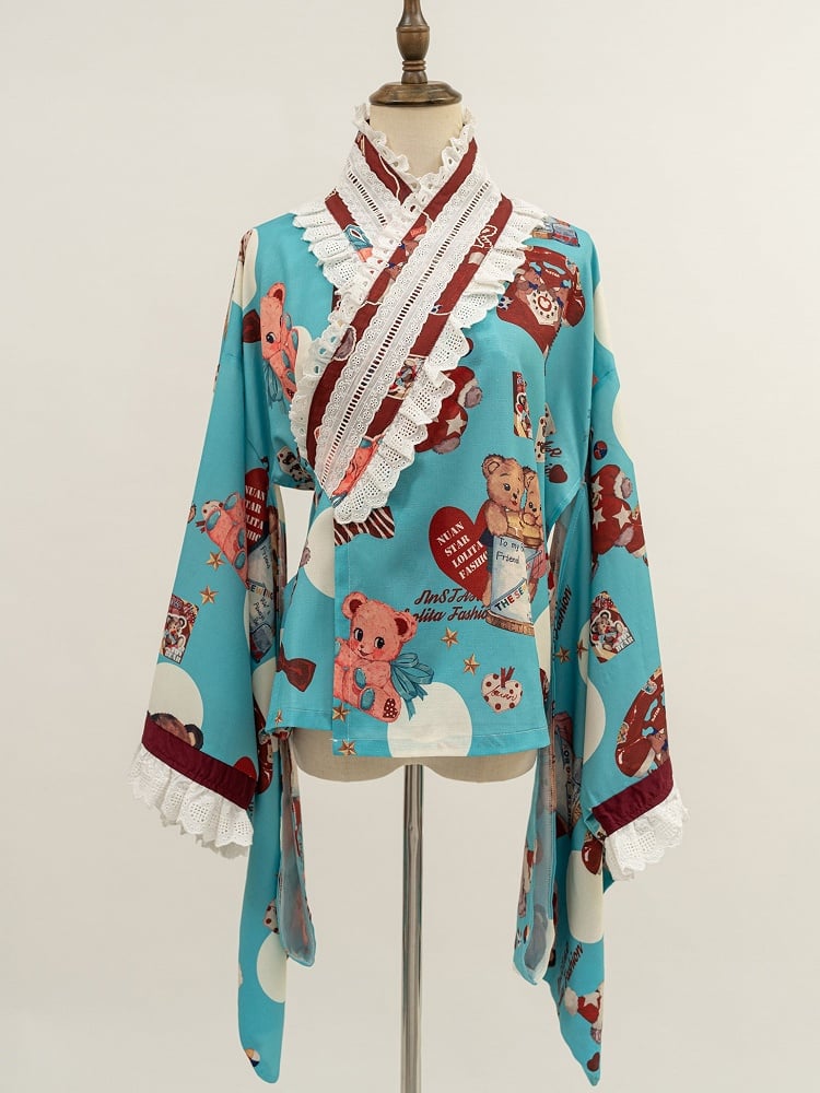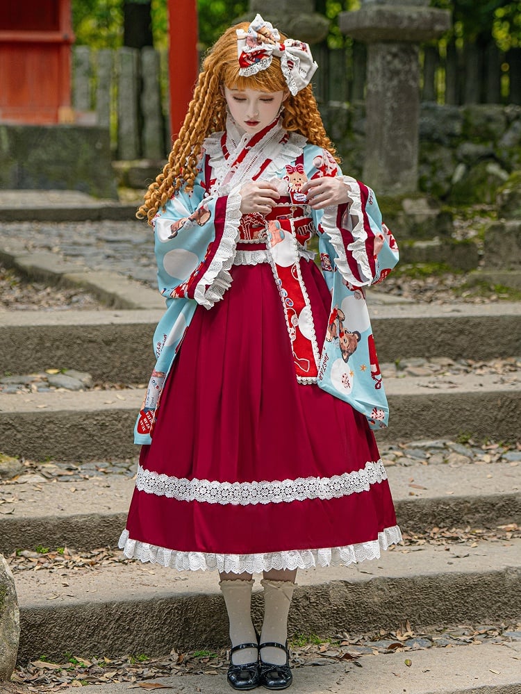 Wa Print + Bear Top Crossover Lace Dress Design Lolita Set Blue JSK Trimmed Red