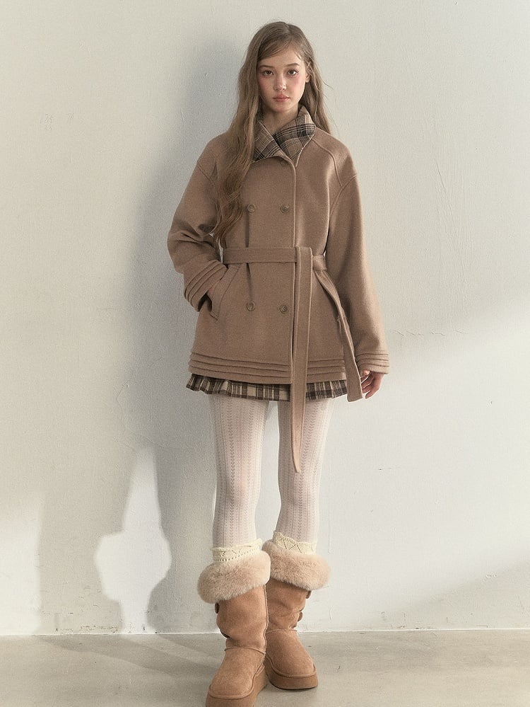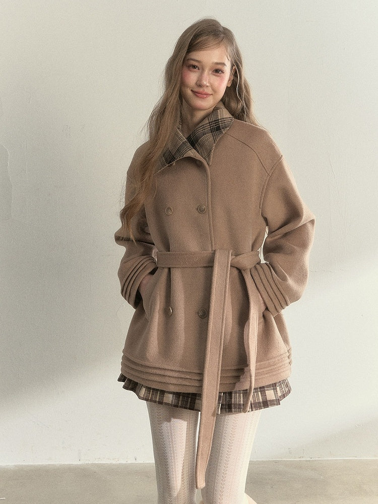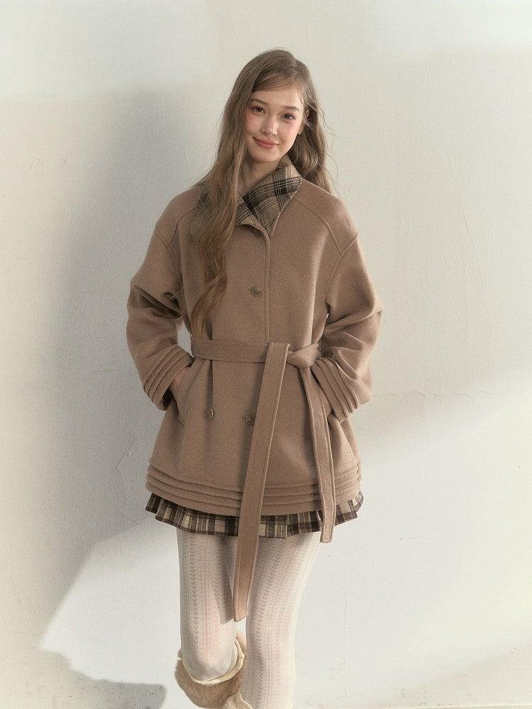 Khaki Vintage Double-breasted Wool Coat with Checked Collar and Belted Waist