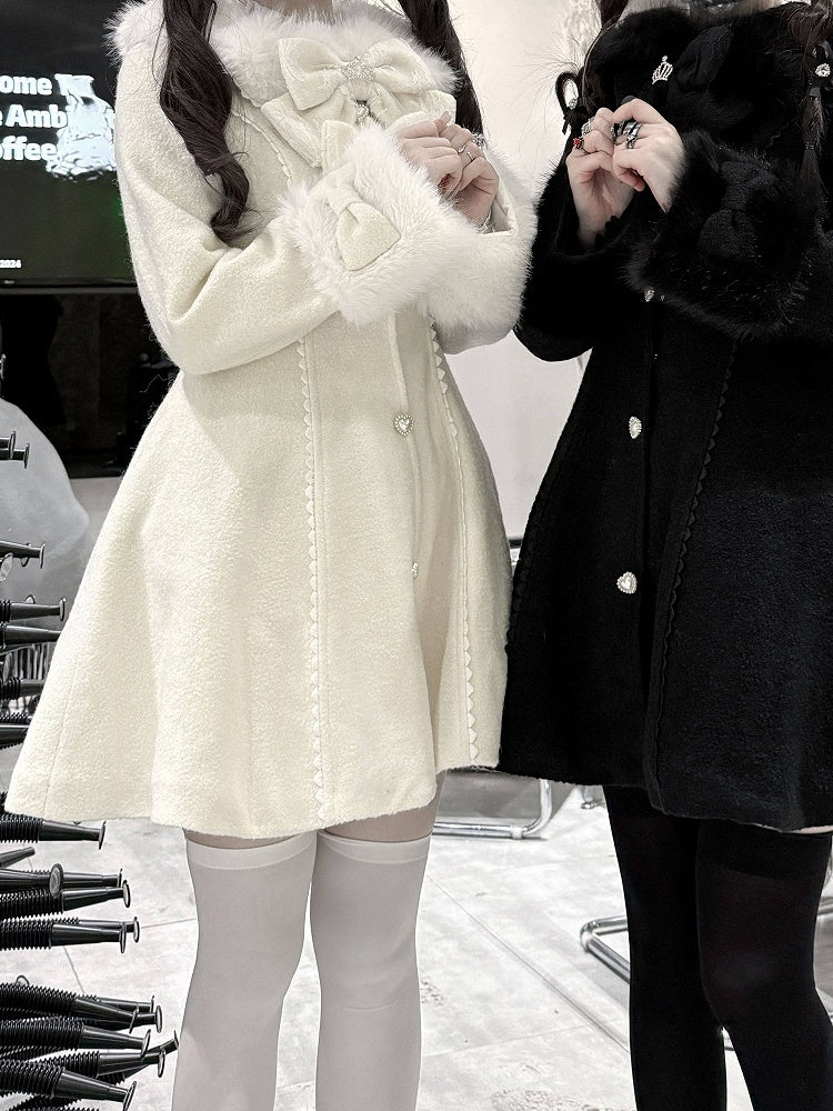 Beige Landmine Style Bow-Detailed Long Waist-Cinching Coat with Furry Collar & Cuffs