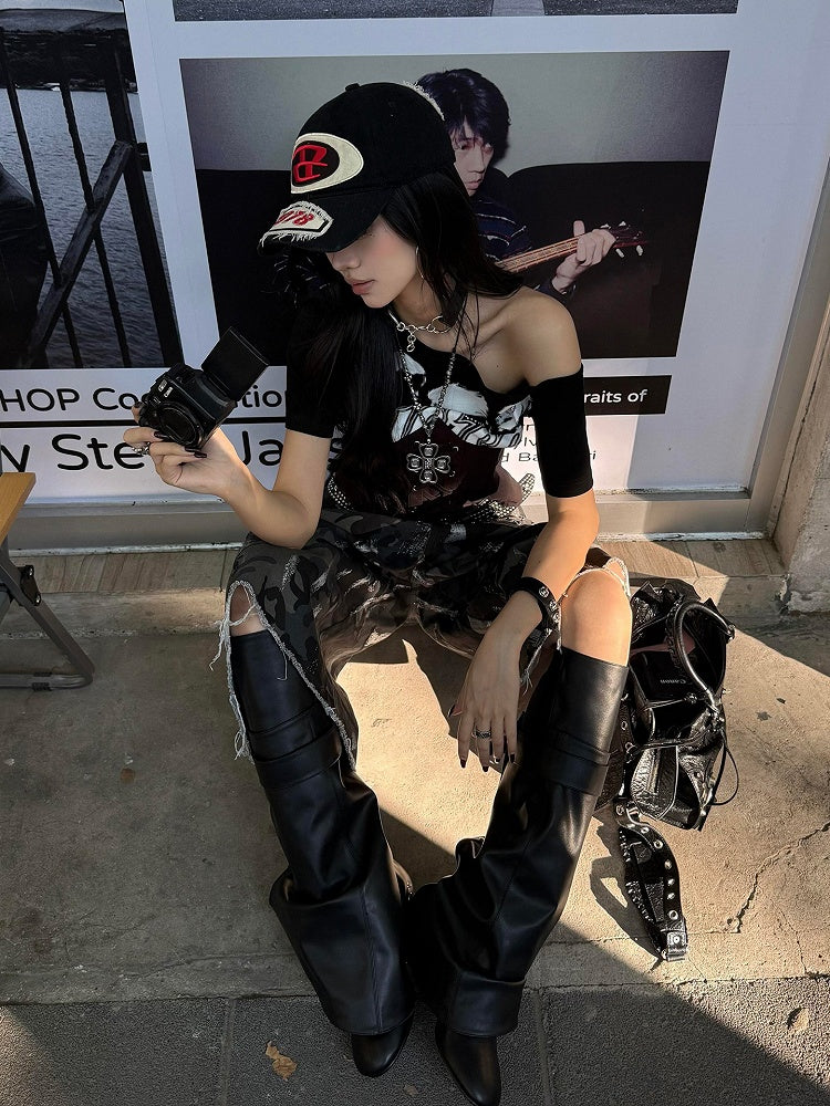 Black / White Asymmetrical Neckline T-Shirt with Lace-up Waist