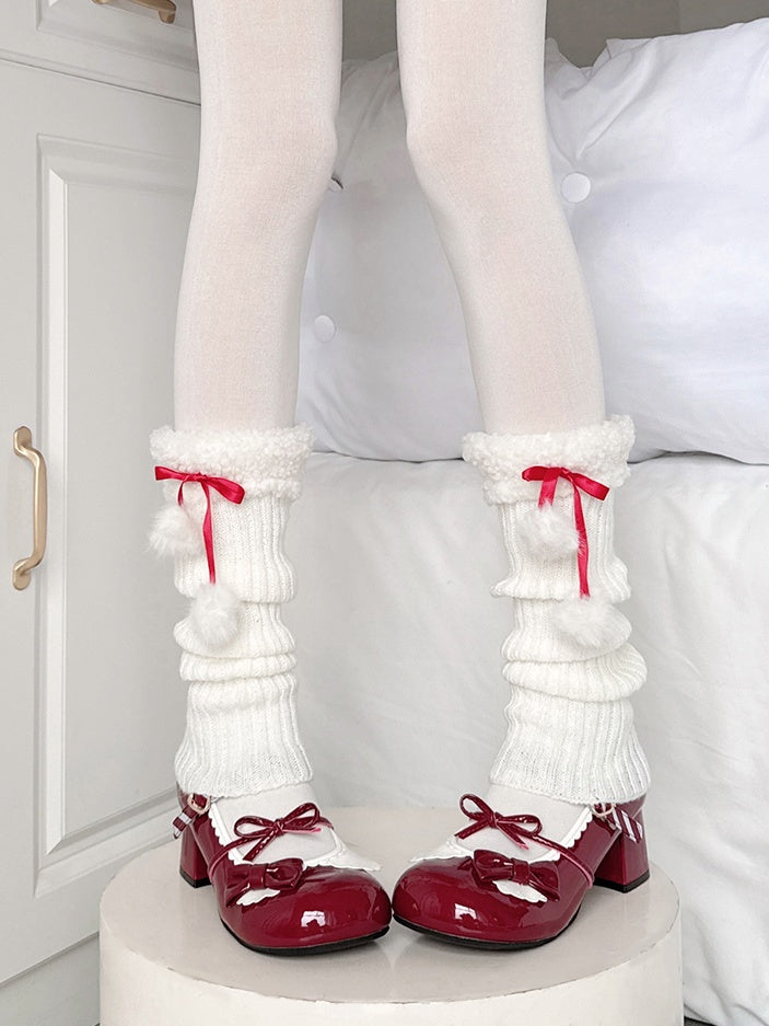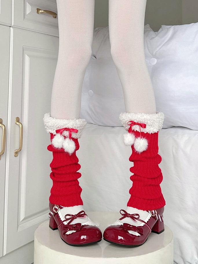Red/White Pom-pom Decorated Fleece-trimmed Knitted Leg Warmers