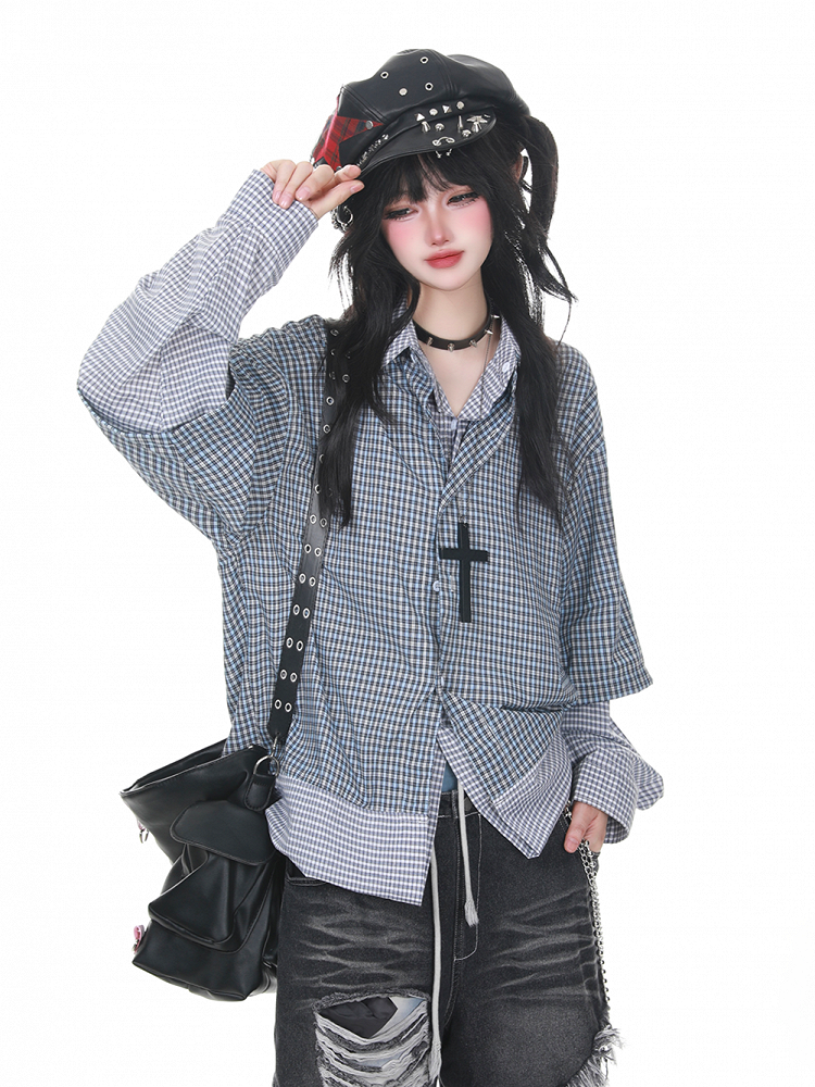 Blue Deconstructed Faux Two-Piece Plaid Shirt-Two Ways Wear