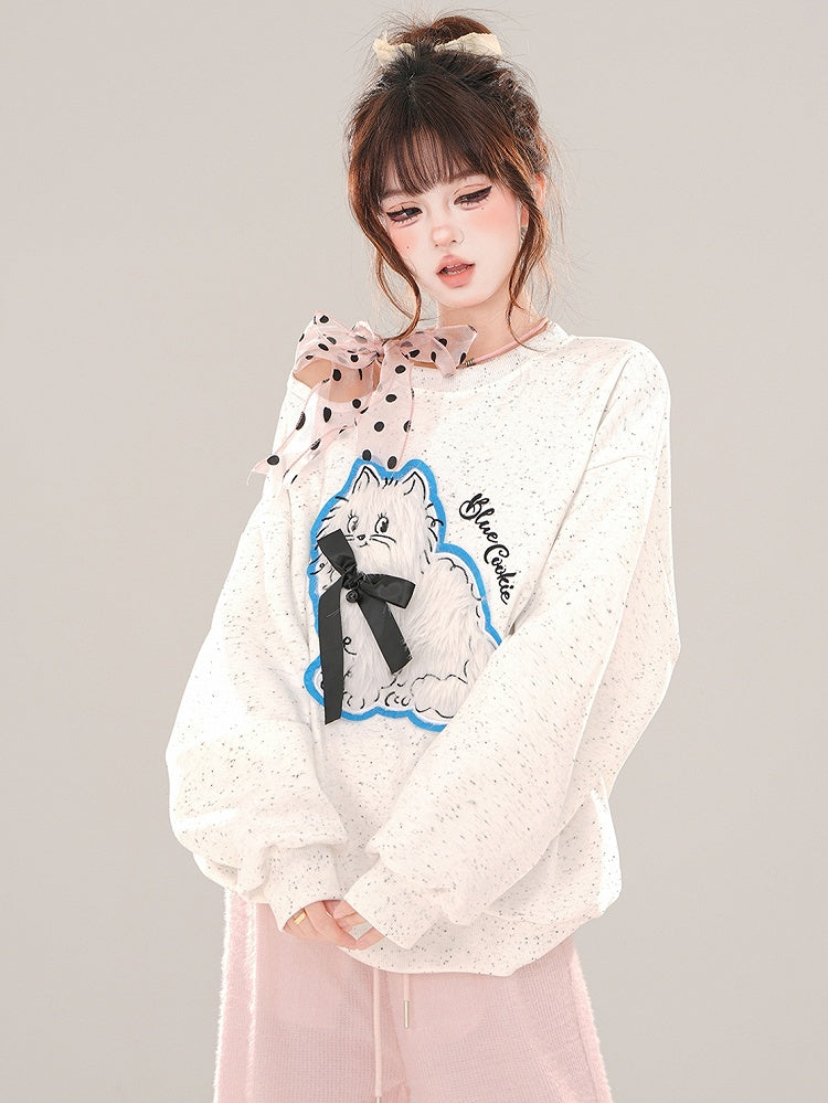White/Blue Cute Kitty Applique Cutout Shoulder Sweatshirt Self-tie Ribbon