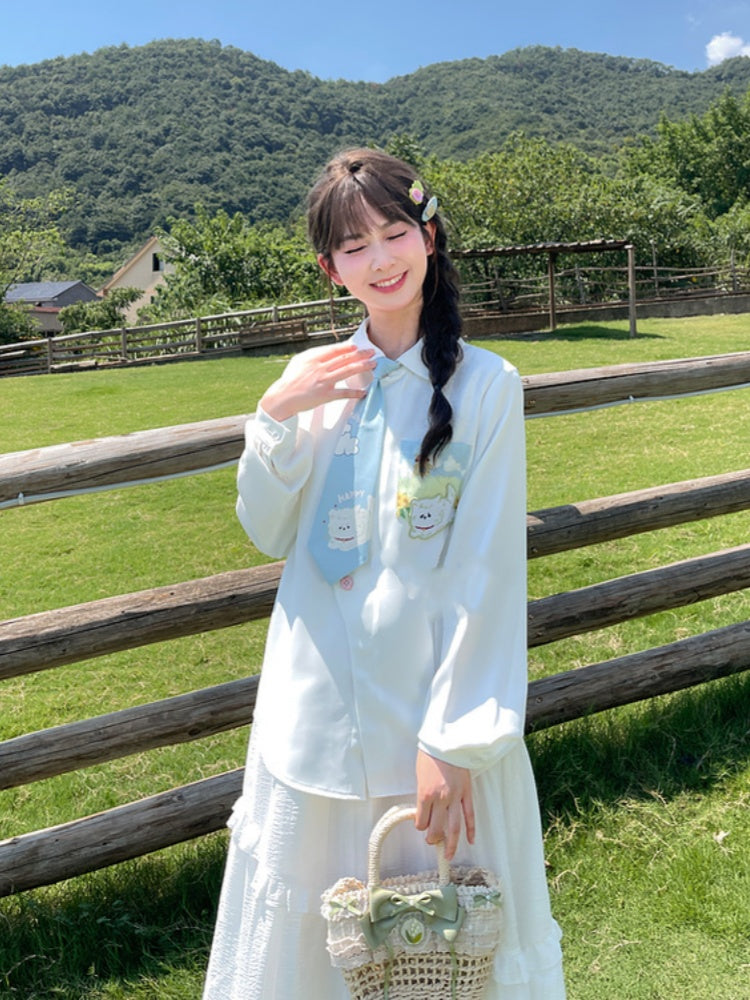 White Floral-Shaped Buttons Puppy Pattern Pocket Shirt with Tie