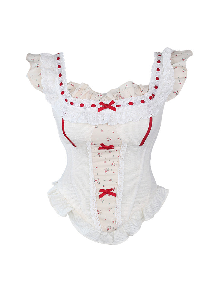● Bowknot Details / Curved Hem / Floral Print / Lace Trim / Ruffle Trim